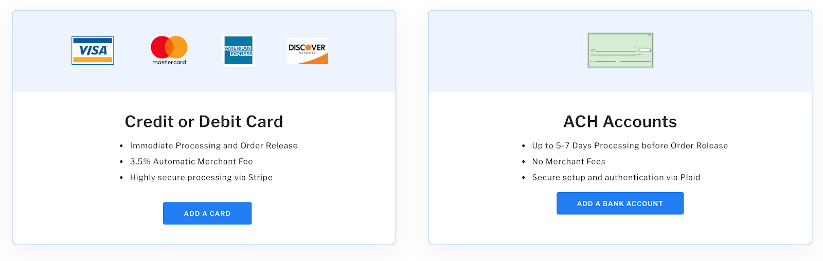ACH payments require bank authorization before funds are released, causing a delay in order processing. For faster turnaround, we recommend using a credit card as your primary payment method.