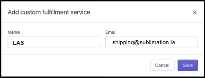 Enter “shipping@sublimation.la” as the email and “LAS as the name, then click “Save.”